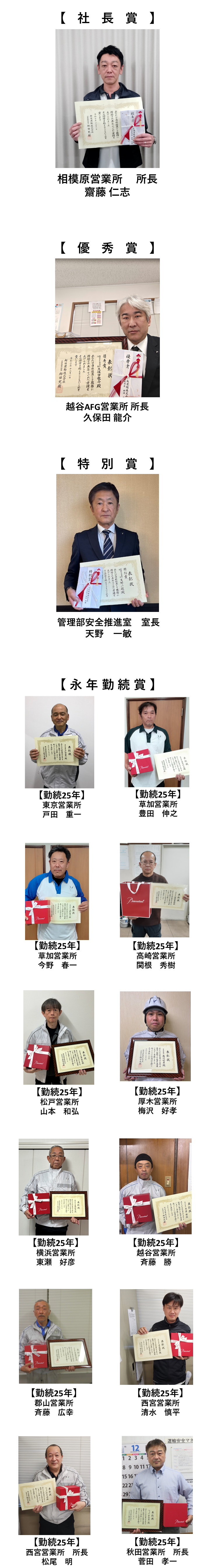 企業情報 事業案内 環境への取り組み 採用情報 トピックス 2025年度 社長賞 優秀賞 特別賞 永年勤続賞 お知らせ 2026.1.19 2025年度 社長賞、優秀賞、特別賞、永年勤続賞の表彰を行いました。 表彰者の方には、賞状と賞金を贈呈します。 検索: 最近の投稿 2025年度 社長賞 優秀賞 特別賞 永年勤続賞 高崎営業所が群馬県警察及び自動車安全運転センターより 優秀安全運転事業所として金賞を授与されました。 2024年度 社長賞 優秀賞 勤続永年賞 2024年度 無事故表彰 2024年度MVP 最近のコメント安全大会(小名浜営業所) に WordPress コメントの投稿者 よりアーカイブ 2026年1月 2025年12月 2025年5月 2025年4月 2025年3月 2024年3月 2023年5月 2022年12月 2022年3月 2021年8月 2021年3月 2021年1月 2020年9月 2020年7月 2020年3月 2020年2月 2019年12月 2019年8月 2019年2月 2018年10月 2018年6月 2018年4月 2018年2月 2017年12月 カテゴリー お知らせ メタ情報 ログイン 投稿フィード コメントフィード WordPress.org